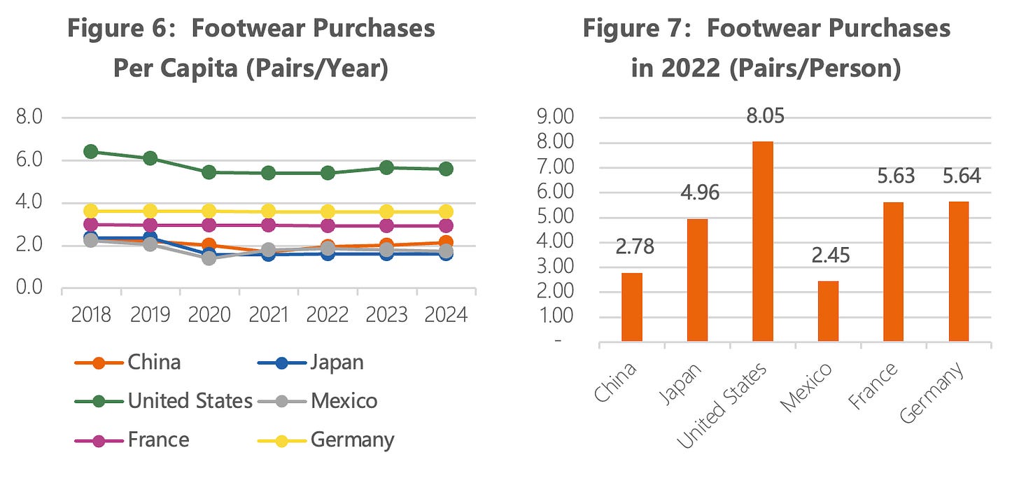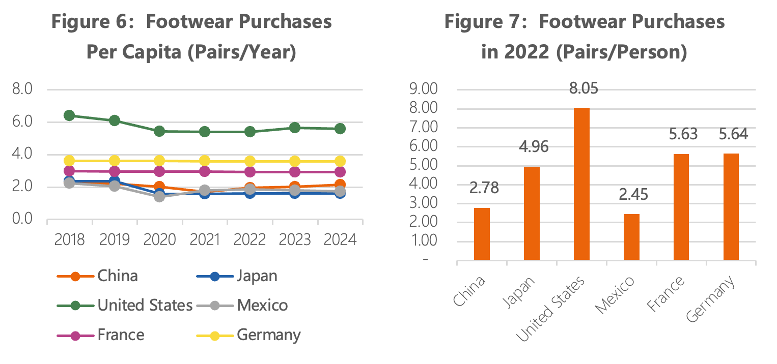 We also referred to data from the "World Footwear Yearbook 2023" for additional insights. According to the Yearbook, China’ s per capita shoe consumption in 2022 was 2.78 pairs, slightly higher than Mexico's 2.45 pairs per person. Japan, France, and Germany have similar consumption levels, around 5 pairs per person, while the United States has the highest per capita shoe consumption at 8 pairs per person.