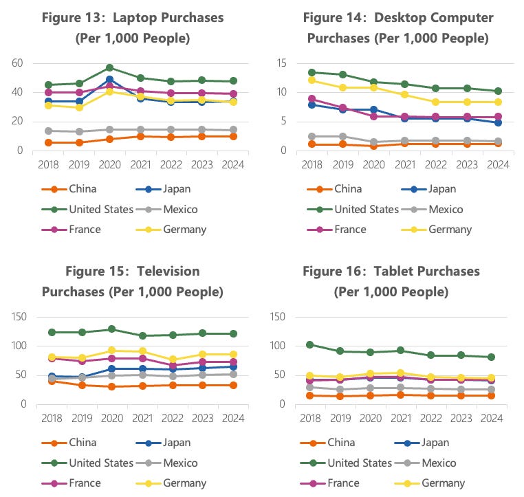 China’s per capita consumption of electronic products is indeed lower than that of other economies and also falls below the consumption levels of countries at similar stages of development. However, even so, the gap in per capita electronic product consumption between China and other countries is smaller than the gap measured by per capita consumption expenditure.