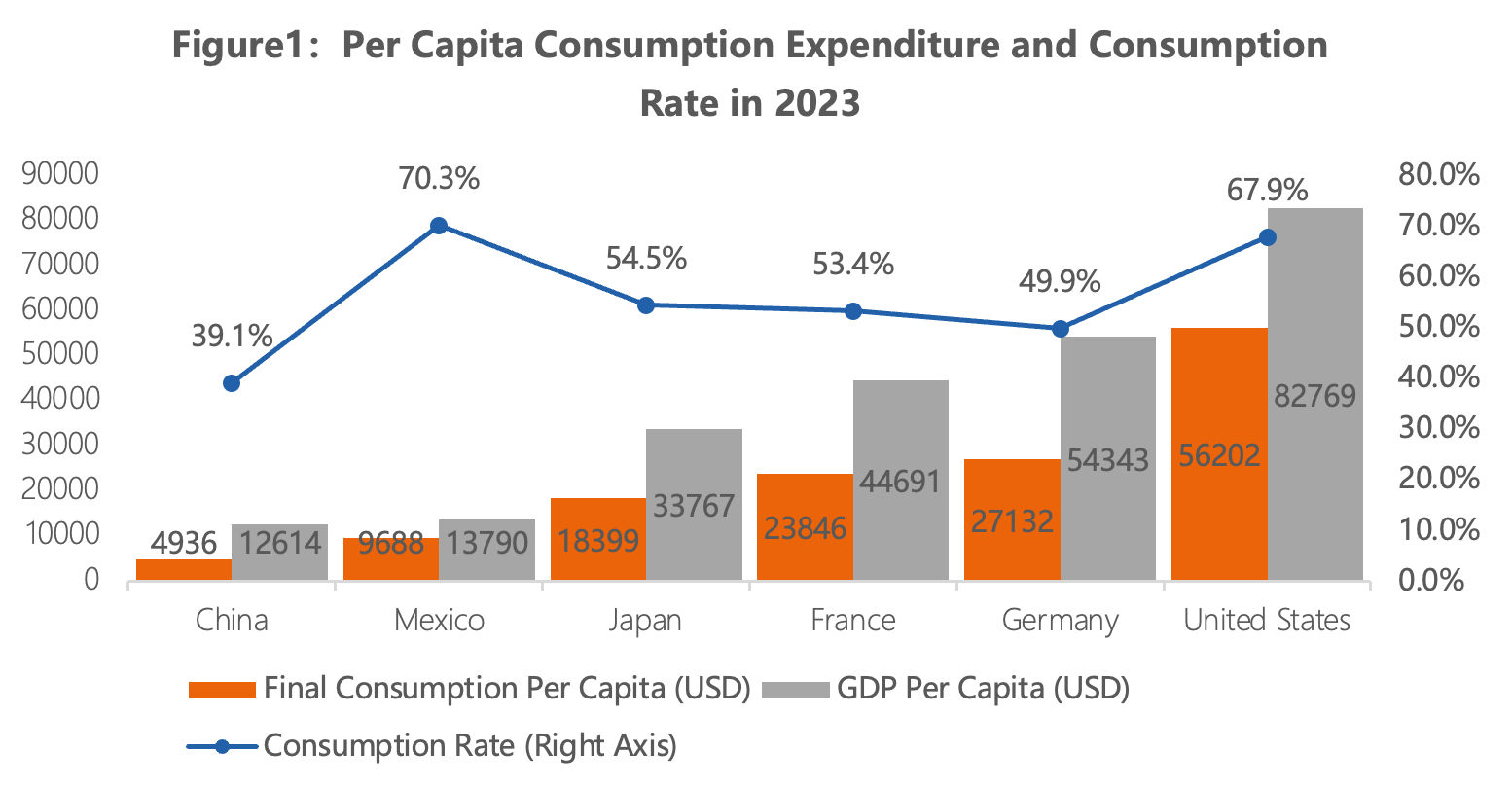 As shown in Figure 1, the per capita GDP levels of China and Mexico are relatively close, at $12,600 and $13,800 respectively. However, China's per capita household consumption is $4,936, which is only half that of Mexico. This also means that China's consumption rate is far lower than Mexico's, with Mexico's consumption rate at 70.3% in 2023, while China's is at 39.1%.