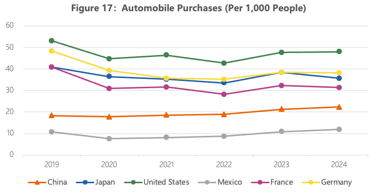 Due to differences in the classification of passenger vehicles and commercial vehicles between the United States and other countries, we combine these categories to analyze automobile consumption. As illustrated in Figure 17, the volume of automobile purchases in China has shown a continuous upward trend, starting from 18 vehicles per 1,000 people in 2019 and expanding further in recent years, projected to reach 22 vehicles per 1,000 people by 2024. China’s level of automobile consumption is far higher than Mexico’s, nearly double its consumption volume, and the gap with developed economies is steadily narrowing.