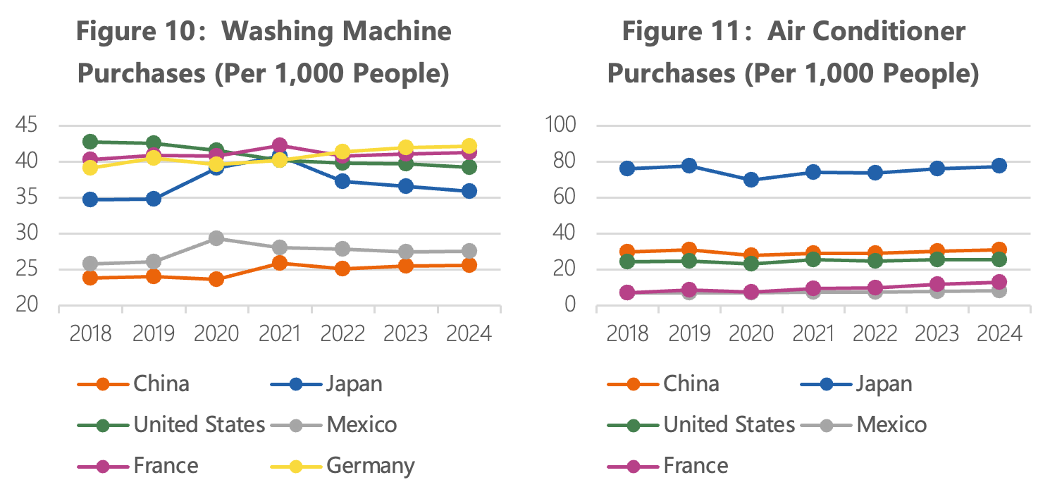 In terms of air conditioner, China has a purchase volume of 31 units per thousand people, which is significantly lower compared to Japan's 78 units, yet still surpasses other sample economies. In 2024, the United States has a purchase volume of 26 units per thousand people, France 13 units, and Mexico 8 units, all of which fall below China's consumption level.