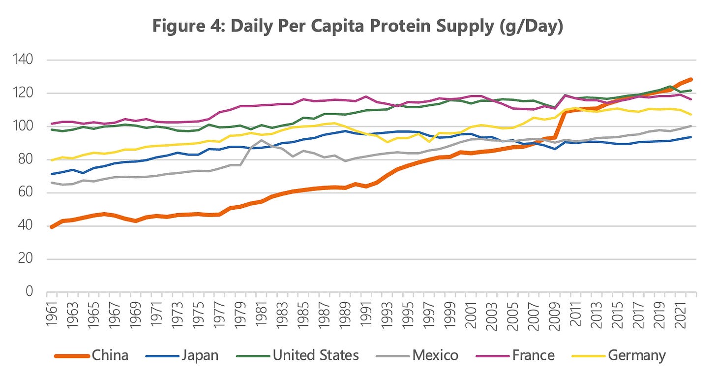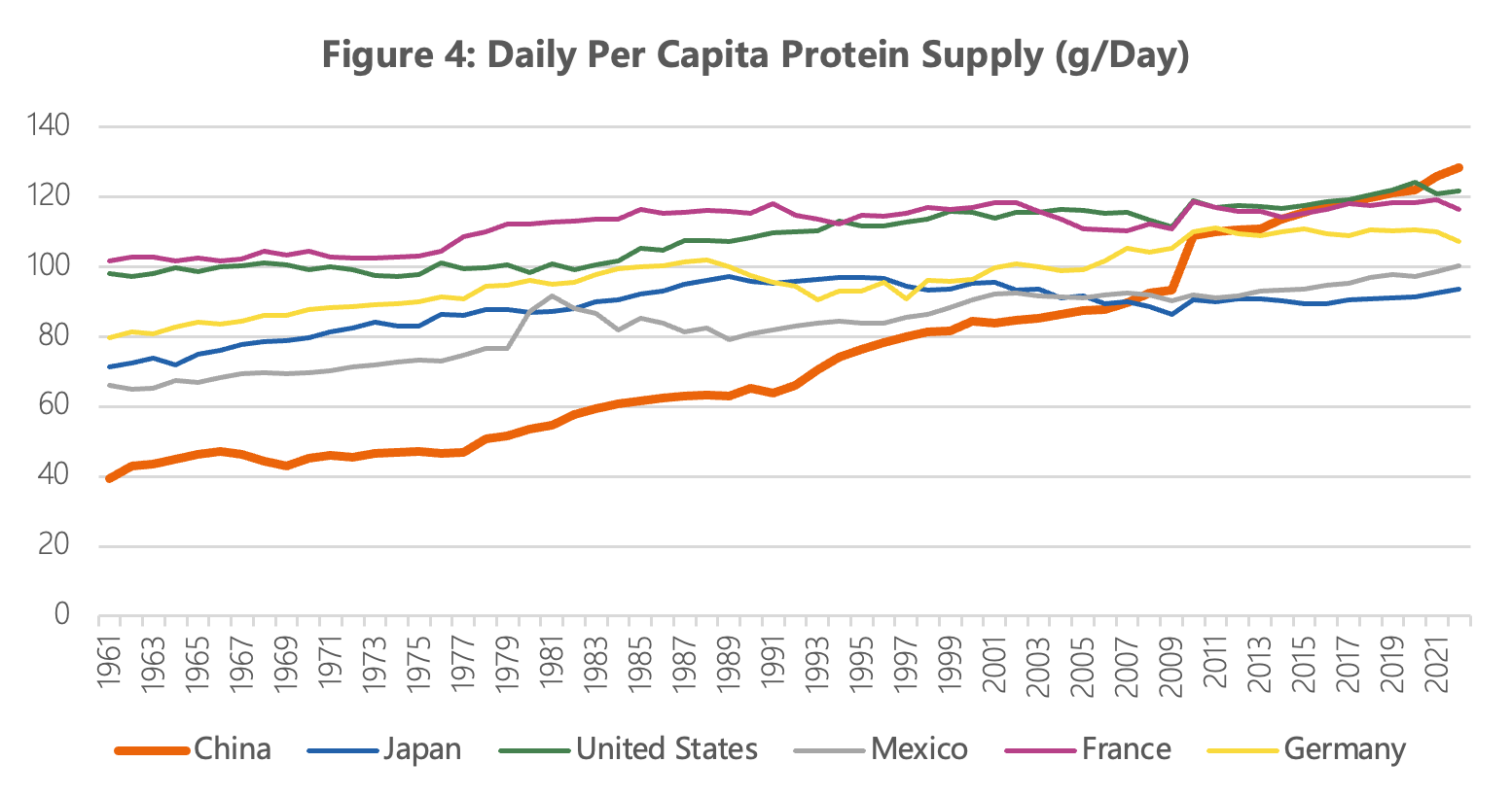 In terms of nutrient supply, we selected protein supply as a representative measure. The per capita protein supply for Chinese residents also shows a significant upward trend. As illustrated in Figure 4, it increased from 40 grams per day in 1961 to 128.5 grams per day in 2022, representing approximately a threefold growth. It is important to note that after 2010, the Food and Agriculture Organization (FAO) updated its statistical methods and population data, leading to a certain degree of leap in data for many economies between 2009 and 2010, with China showing the largest increase. From a horizontal perspective, China’ s per capita protein supply surpassed that of Mexico, a country with a similar development level, in 2009, exceeded Japan in 2008, Germany in 2012, and France in 2015. By 2021, China’ s per capita protein intake reached 125.9 grams per day, surpassing the level of the United States. Currently, China’ s protein supply has fully reached and exceeded the average level of developed countries.