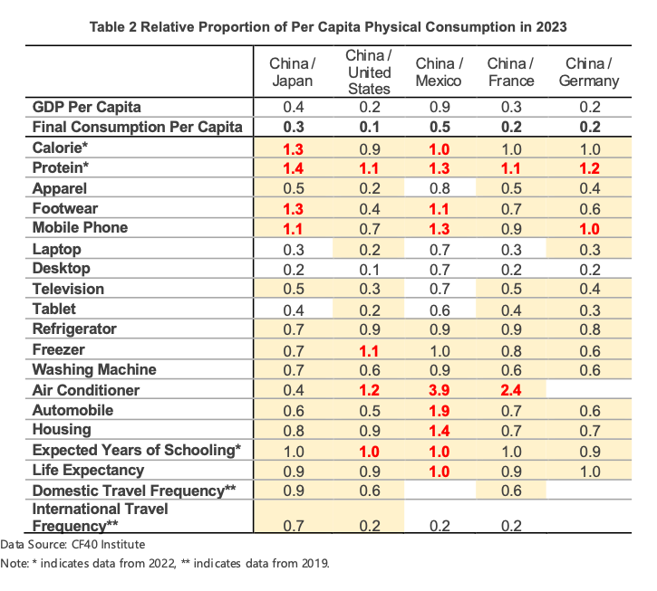 First Dimension: Comparison of Absolute Consumption Volume. Red font indicates that the absolute value of this type of consumption in China has surpassed other countries (relative ratio greater than 1). In key areas such as food, mobile phones, certain household appliances, education, and healthcare, China's consumption volume or consumption utility has directly reached or even exceeded that of some developed countries.