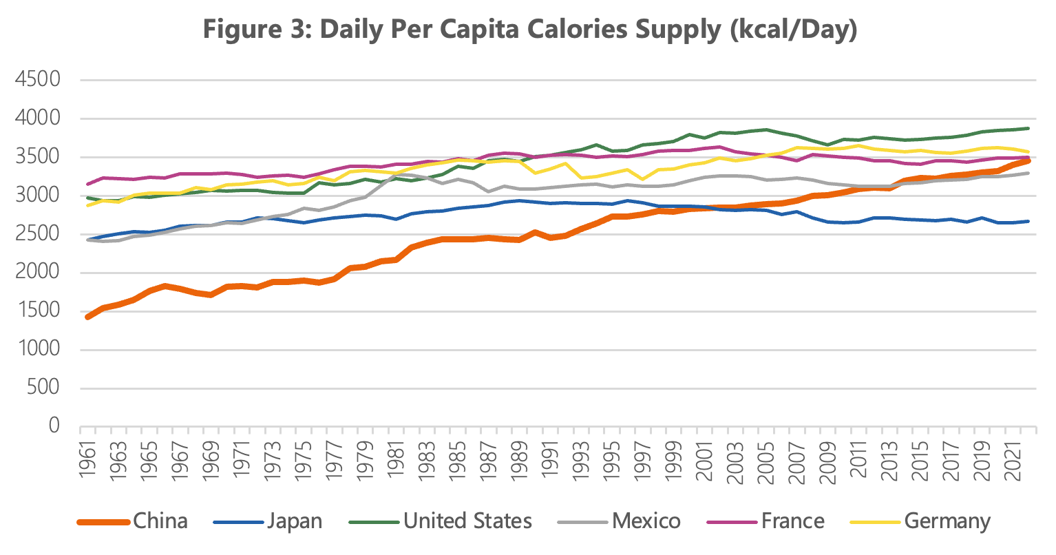 We use per capita calorie supply1 as a core indicator to measure the energy acquisition and consumption of a country's residents. As shown in Figure 3, China's per capita calorie supply exhibits a clear upward trend, rising steadily from approximately 1,400 kcal/day in 1961 to 3,453 kcal/day in 2022. Compared to Mexico, which is at a similar stage of development, China's per capita calorie supply surpassed Mexico in 2013. In comparison with developed countries, China exceeded Japan in 2002, and the gap continues to widen, partly due to differences in dietary structures between China and Japan. In 2022, France and Germany had per capita calorie supplies of 3,505 kcal/day and 3,573 kcal/day, respectively, with China having nearly caught up with France and Germany. Meanwhile, the gap between China and the United States has progressively narrowed, with China's per capita calorie supply reaching 90% of that of the United States by 2022.