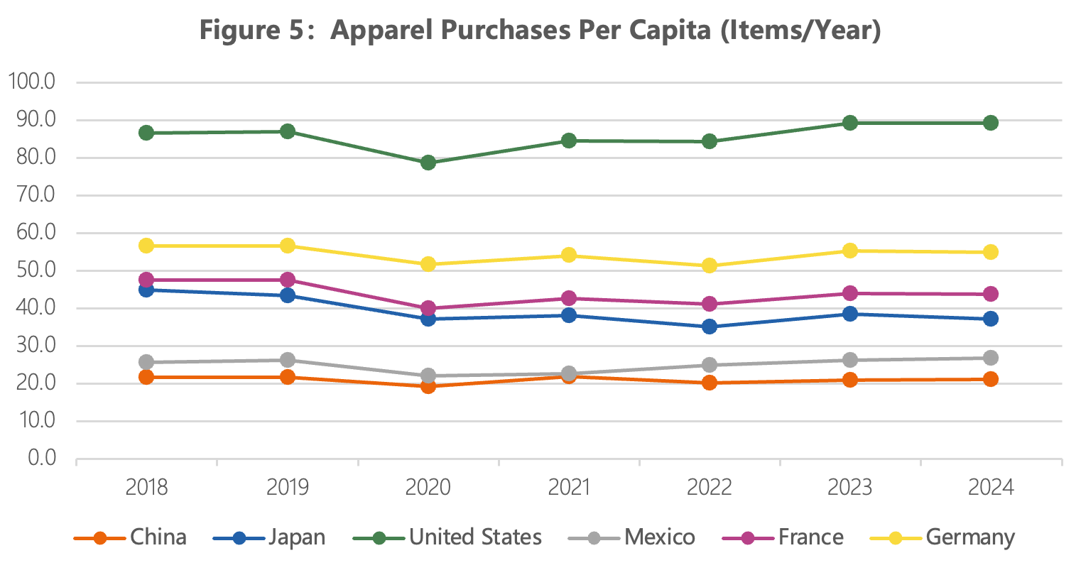 As illustrated in Figure 5, the annual per capita purchase of apparel in China has remained relatively stable at around 22 items, showing little fluctuation and roughly equivalent to that of Mexico. In 2024, the per capita apparel purchases in Japan, France, Germany, and the United States were 37, 43, 55, and 90 items, respectively—approximately 1.8, 2.1, 2.6, and 4.3 times that of China.