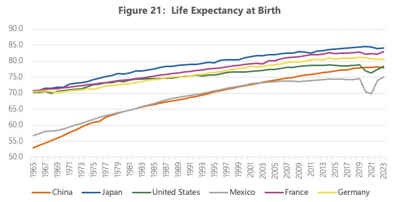 However, it can, to some extent, measure the level of medical services enjoyed by a country's residents. As shown in Figure 21, China's average life expectancy has experienced a long period of stable growth, starting from 53 years in 1965 and reaching 78 years in 2023. China's average life expectancy maintained a similar level to that of Mexico until 2004, after which China continuously improved and gradually widened the gap. In 2020, China surpassed the United States, and the gap with Japan, France, and Germany is constantly narrowing. In terms of final outcomes, the development of China’s healthcare system has achieved remarkable results and compares well with those of developed countries.