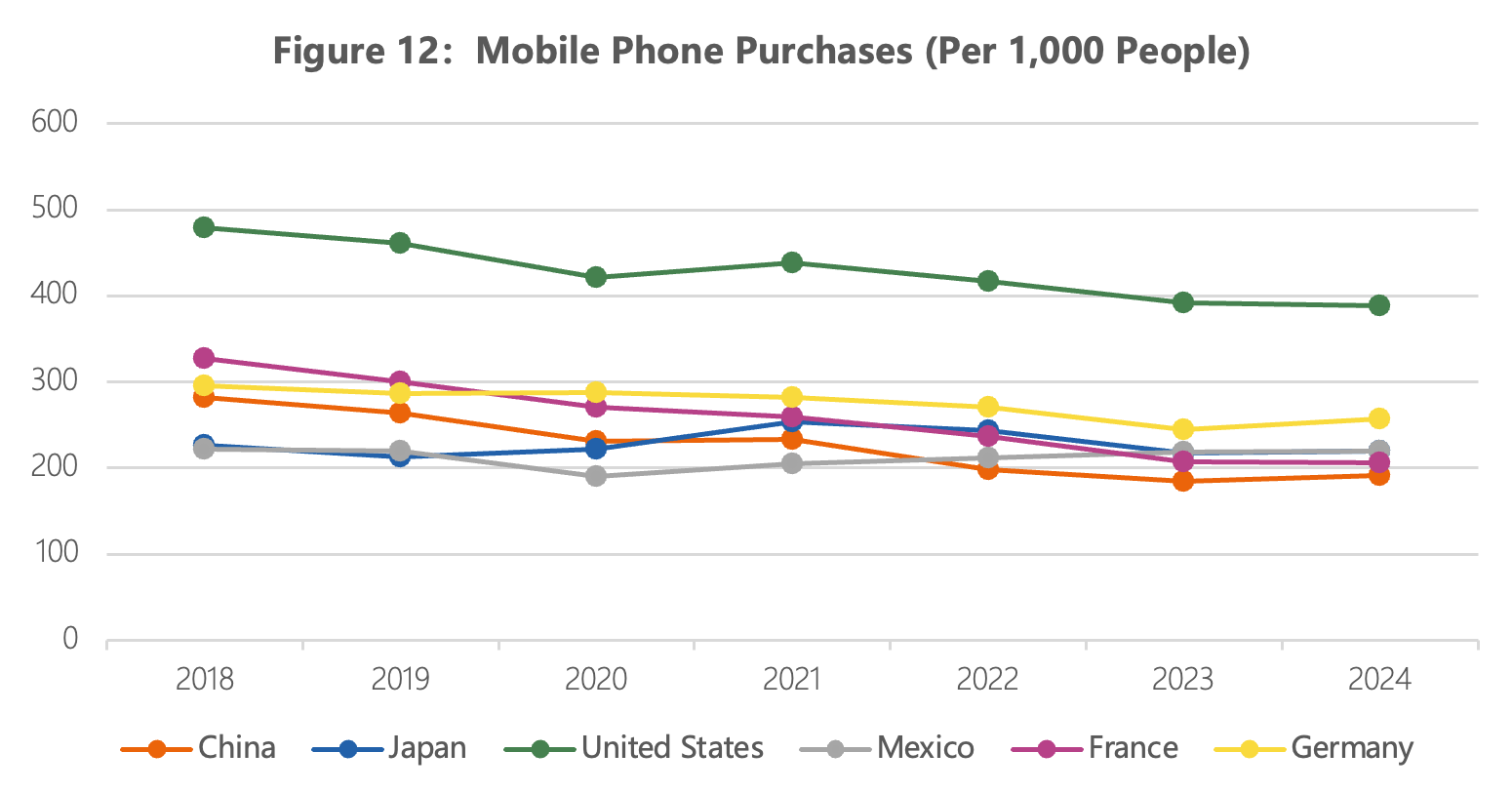 In recent years, the per capita mobile phone purchase volume across various countries has generally shown a downward trend. Mobile phone purchases in China have continuously declined since 282 units per 1,000 people in 2018, with a moderate recovery projected to reach 192 units per 1,000 people by 2024. In 2024, China's mobile phone consumption is slightly lower than that of Germany, France, Japan, and Mexico, but the gap is not significant. The United States has a much higher mobile phone purchase volume per 1,000 people compared to other economies, reaching 388 units per 1,000 people in 2024, which is 1.5 times that of China.