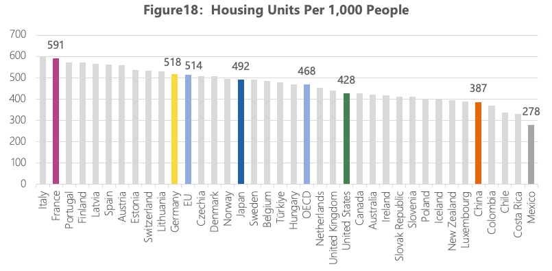 As illustrated in Figure 18, France's per capita housing units reach as high as 591 units per 1,000 people, which is 1.5 times that of China. The United States has 1.1 times China's per capita housing units, Japan 1.3 times, and the OECD average is 1.2 times China's level. Mexico's per capita housing units stand at 278 units per 1,000 people, which is lower than both China and the OECD average. Viewed in this light, China's per capita housing units are not significantly different from the average level of developed economies, and compared to OECD countries, it is roughly positioned at the lower-middle level.